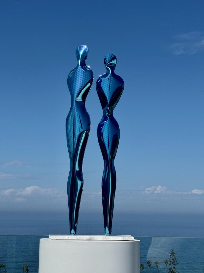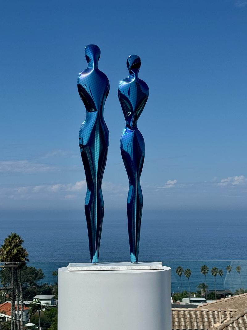Polished stainless steel, translucent blue paint, marble base 47 x 21 x 12 in 119 x 53 x 30 cm